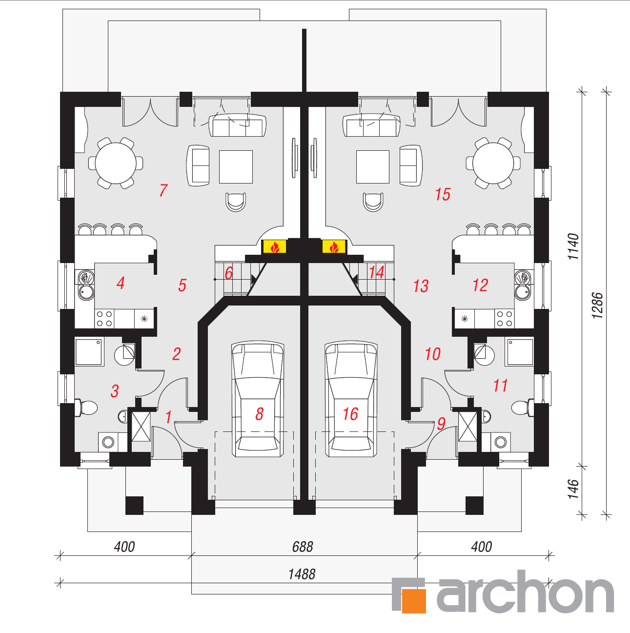 W każdym segmencie zaprojektowano samodzielne mieszkanie, z własnym garażem i niezależnym wejściem. Z wiatrołapu, w którym znajduje się również wejście do garażu, wchodzimy wprost do strefy dziennej parteru. Wnętrze rozwiązane zostało jako niepodzielona przestrzeń; duży salon z kominkiem w narożniku oraz wyjściem na taras płynnie łączy się z jadalnią oraz dalej – z otwartą dobrze doświetloną kuchnią. Widoczne z salonu schody na poddasze uatrakcyjniają pomieszczenie, powiększając również przestrzeń.