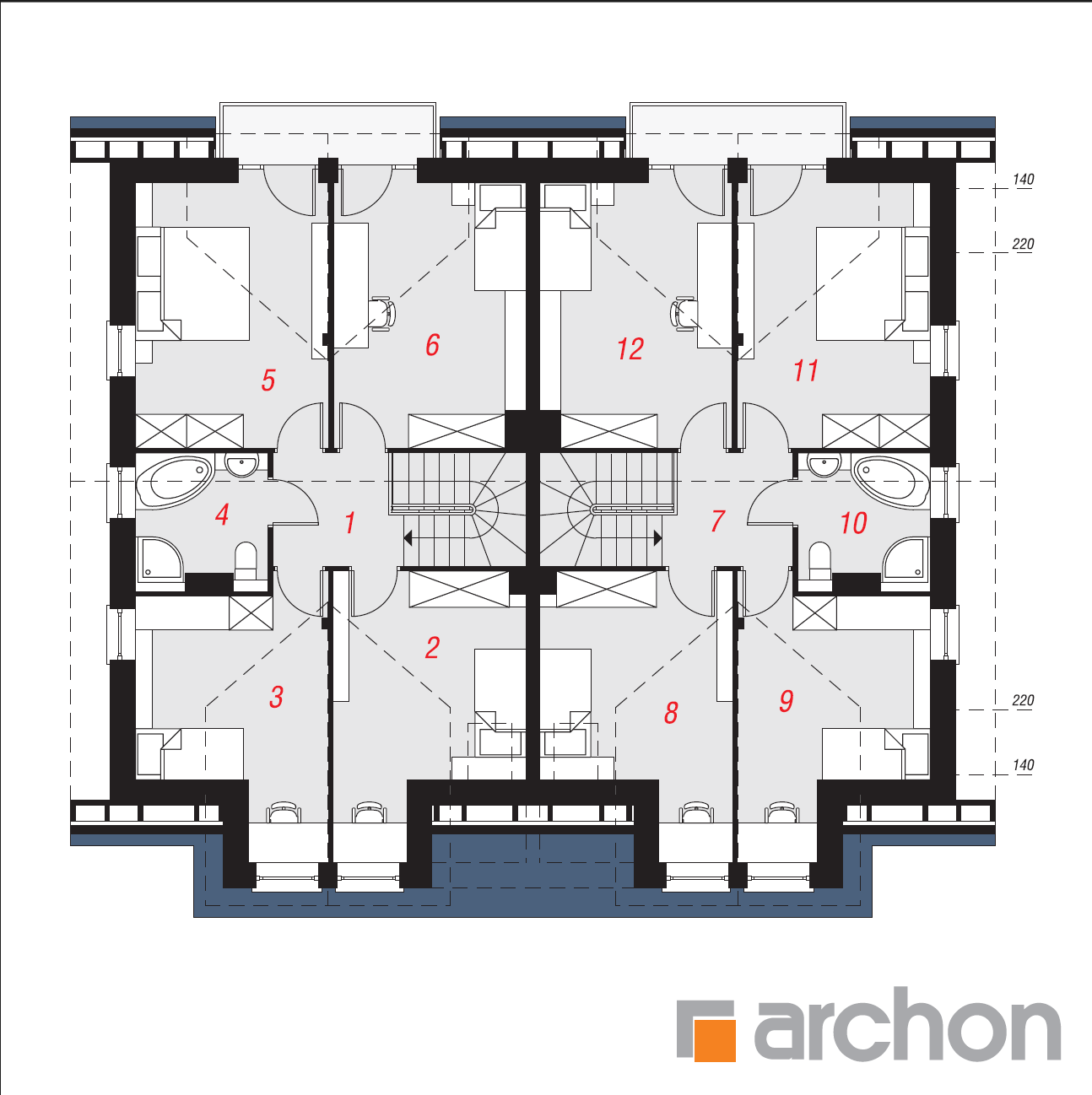Na górze przewidziana została strefa wypoczynku gospodarzy. Ulokowano tu cztery jasne pokoje – w tym dwa ze wspólnym balkonem oraz komfortową łazienkę z natryskiem i narożną wanną. Pokoje nad garażem doświetlone zostały dodatkowym oknem dachowym. Atrakcyjny i starannie zakomponowany dom, stanowi idealne połączenie estetyki, funkcjonalności i racjonalnego wykorzystania powierzchni.